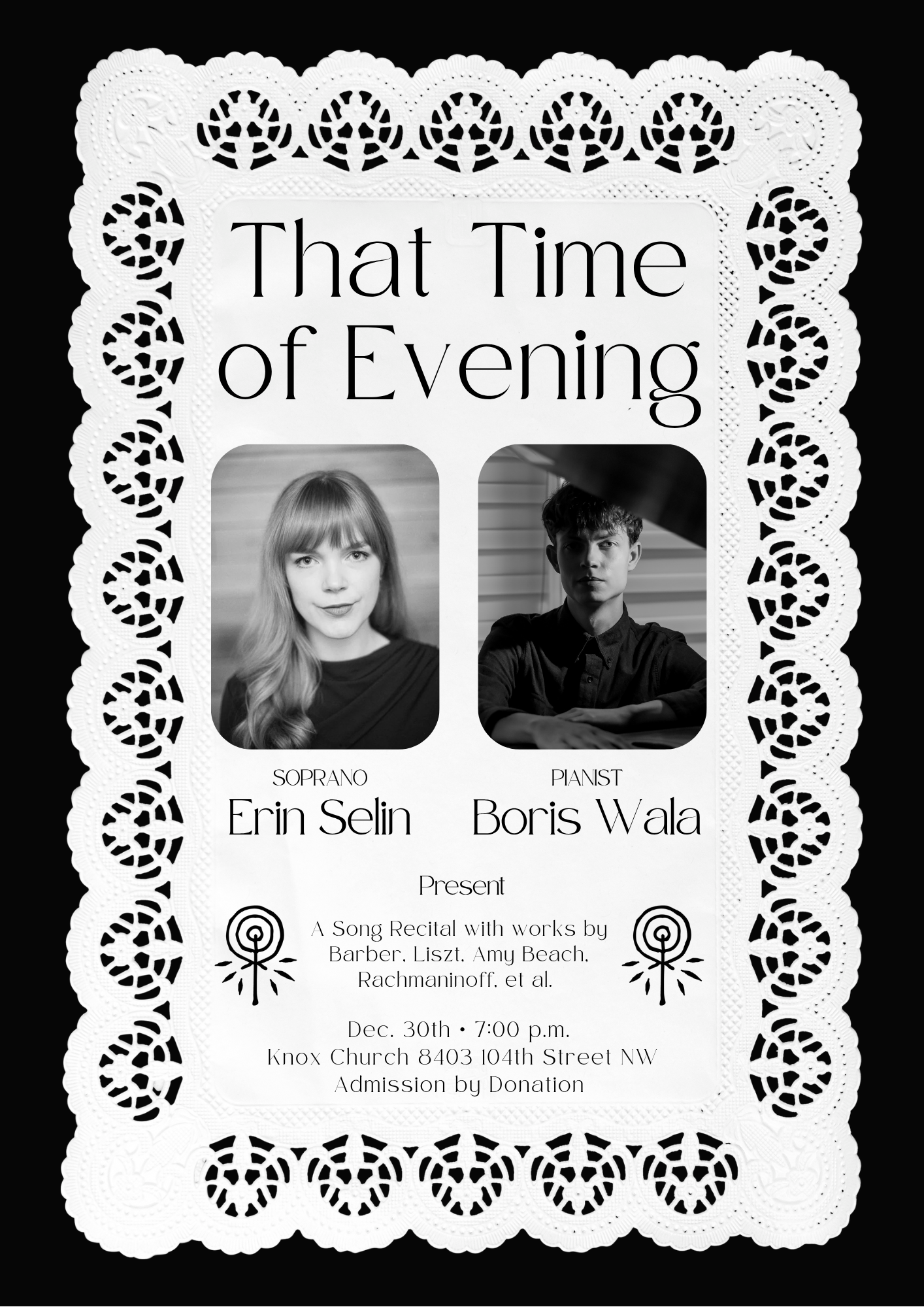 2025 December 30th, 7:00 p.m. Knox Evangelical Church That Time of Evening A Song Recital with soprano Erin Selin https://fb.me/e/6f6i263L3